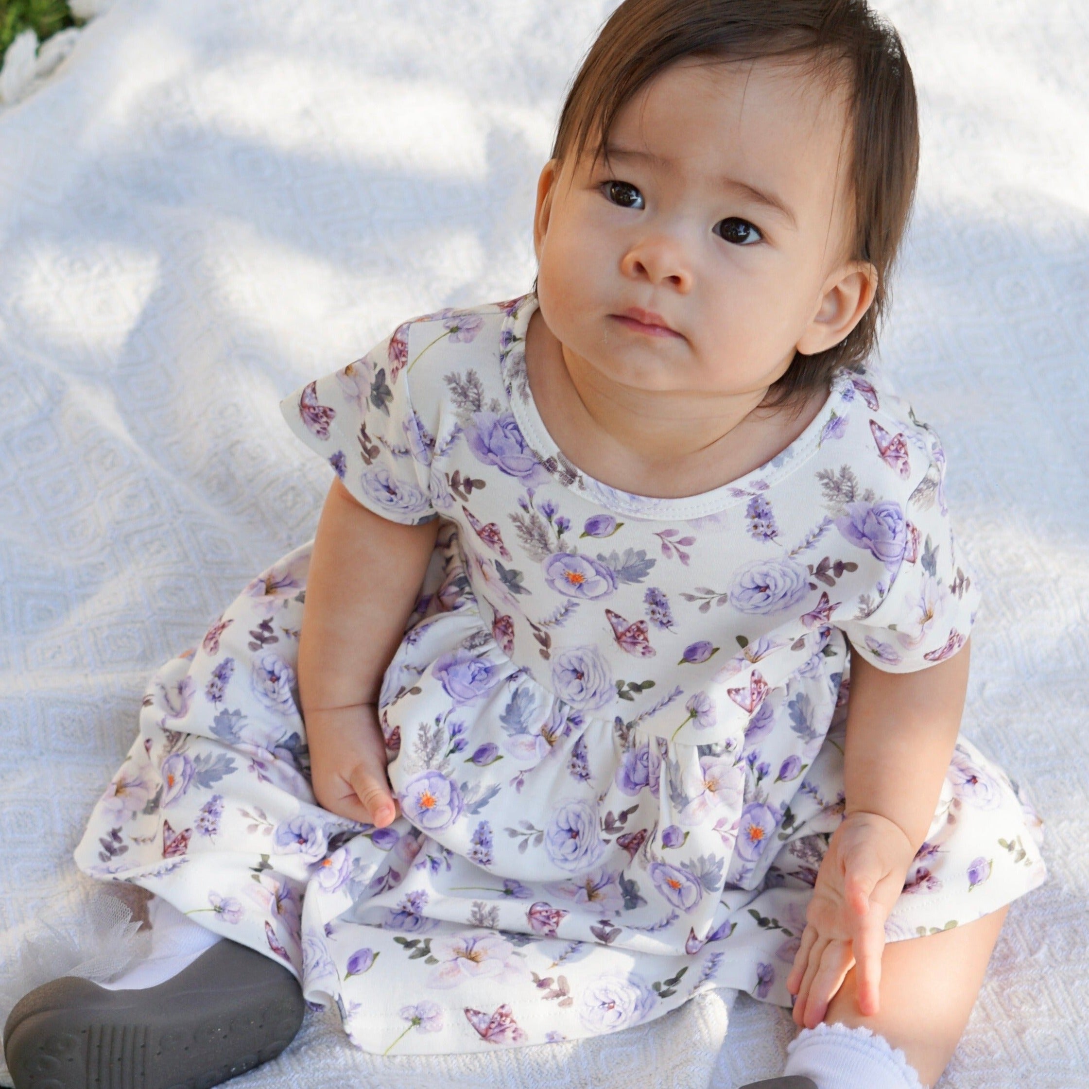 Dress your little one in our Flower Garden Bamboo Dress, a delightful blend of purple florals on a pristine white background. Crafted from a soft, lightweight mix of bamboo viscose and certified organic cotton, this dress is perfect for any special occasion, ensuring your child looks fresh, stylish, and ready to capture hearts.